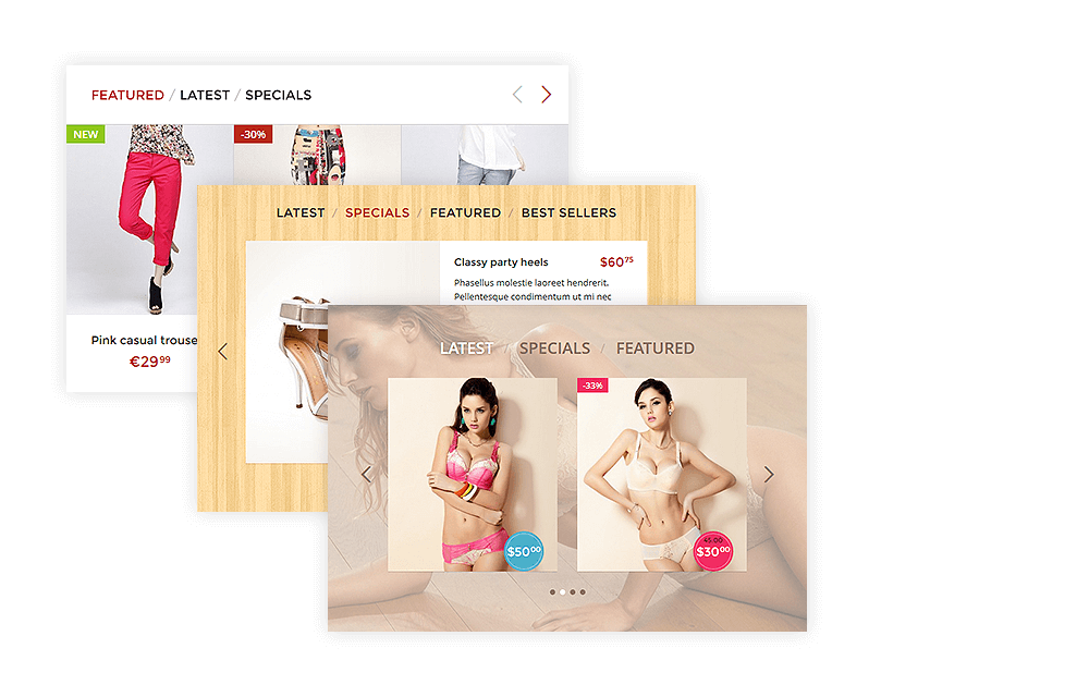You can choose between 3 different list styles: plain - no visual separation between different products; bordered - products are separate by a subtle border; separate each product is an individual box with background color. You have also the option to set different add to cart/wishlist/compare design and position; add product box and product thumbnail hover states; change products per row and spacing between products.