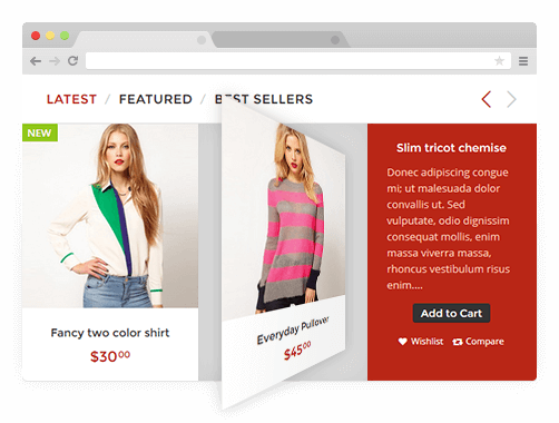 Easily set fancy effects on product and thumbnail hover. You have on your disposal basic append, fade-in or card flip overlay animations.