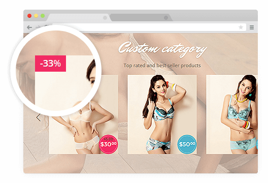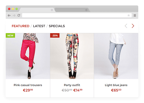 Special products can have a stylish label with the discount percent. You can also specify a period for which all latest items will have a label that will mark the product as “New”.