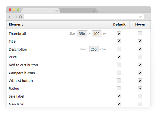 The unique "elements visibility" feature, give you the power to control, which product element to show or hide for a specific product listing for a given state. E.g you can leave only product thumbnails visible by default and show all other information on mouse hover.